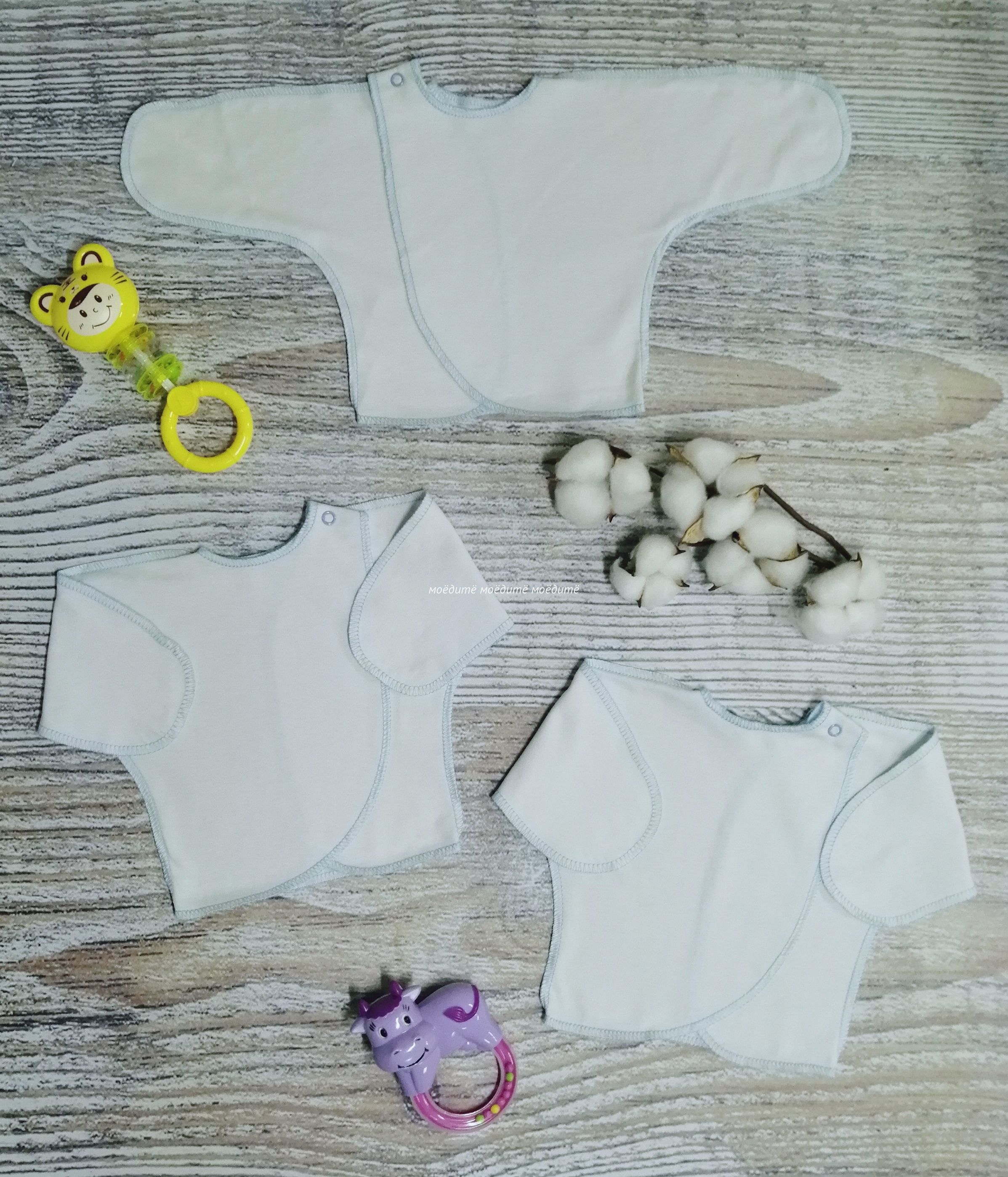 Распашонка с запахом, с одной кнопочкой на одной стороне, с закрытыми ручками. Швы у распашонки выполнены наружу. В комплект к распашонке идеально подойдут "МоёДитё" ползунки "Нарядные" белые с голубым ПК002 "Гардения".